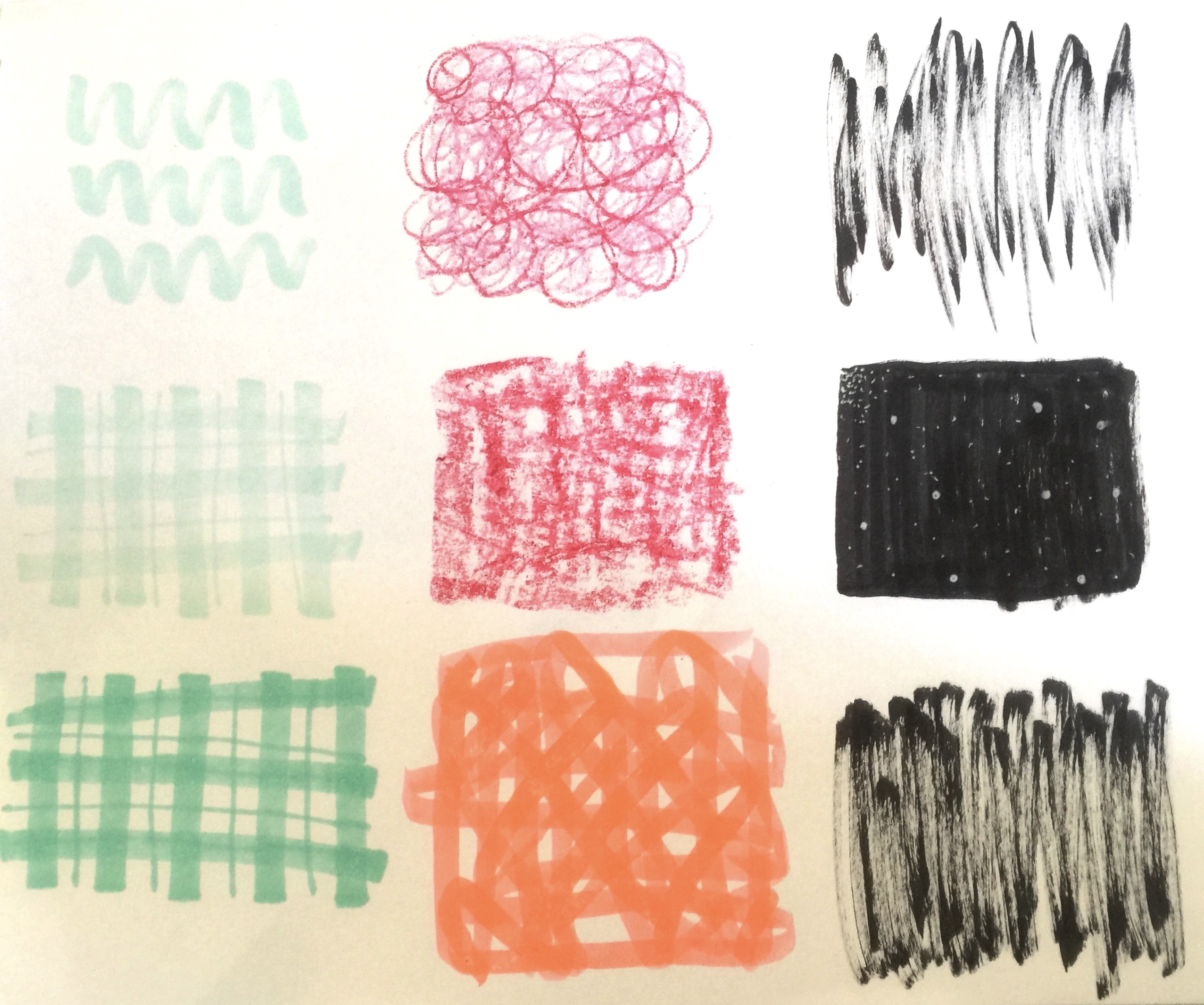 These marks were done outside of class with found materials and the use of ink and acrylic paint.
