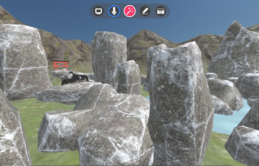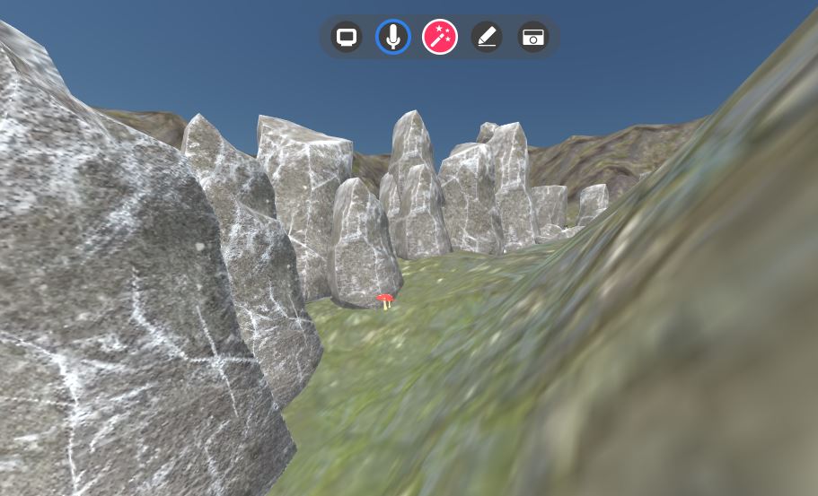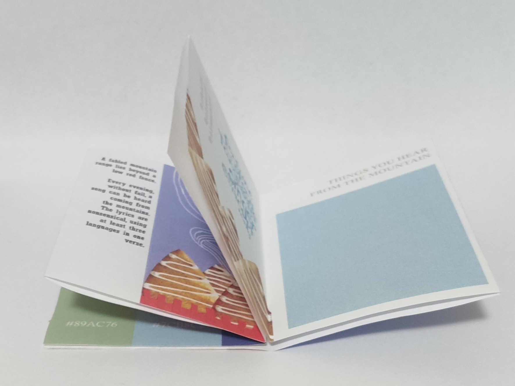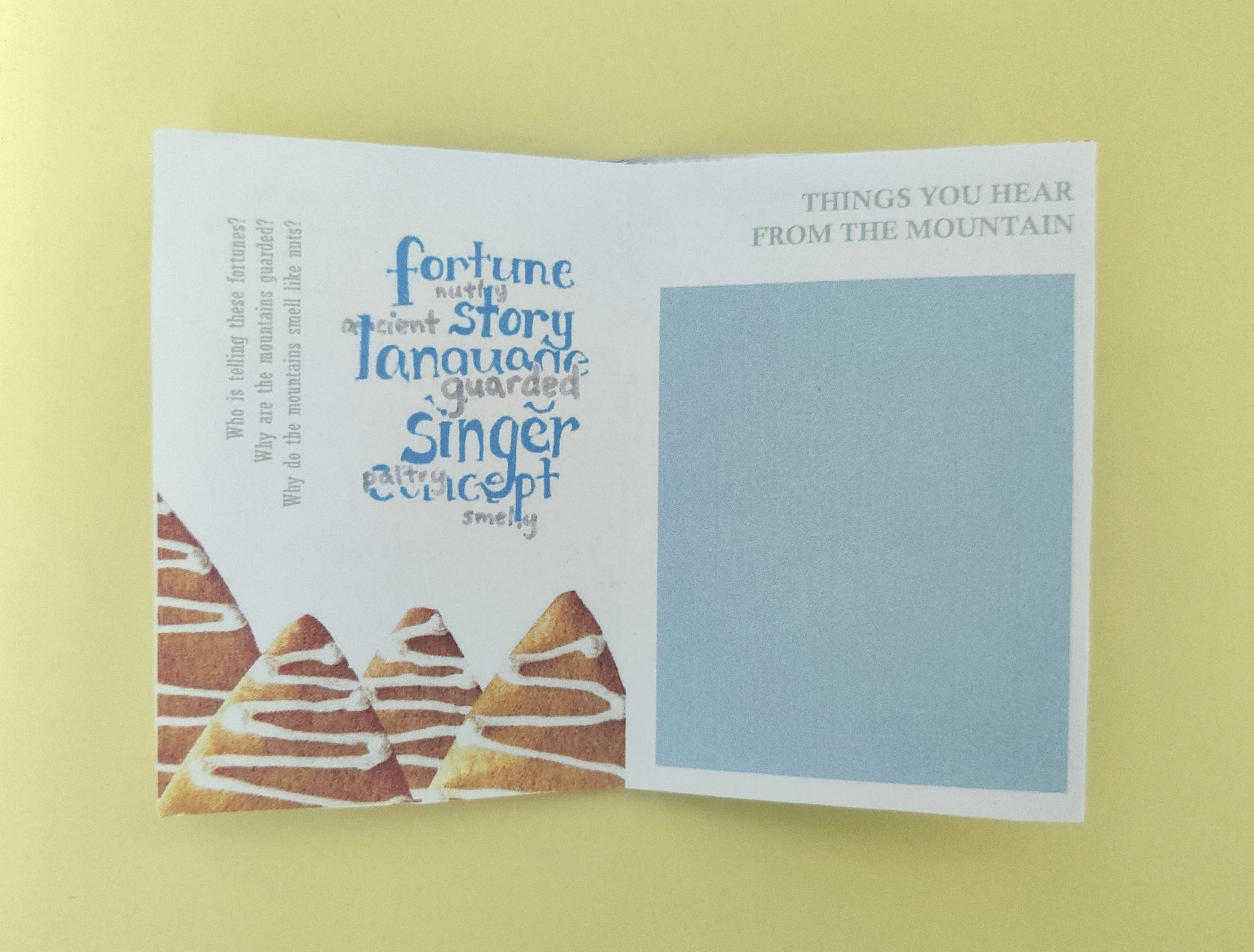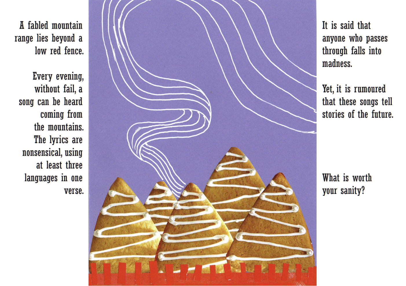 This project brings imagination to reality through collage and VR. My world was created around randomly generated colours and words. The world of "The Nutty Mountain Singer" leaves you stranded in the monutain range, wandering aimlessly among the rocks until you find the exit. People can choose to try finding the exit, or they can track down what is making the strange sounds that got them to go past the red gate in the first place.